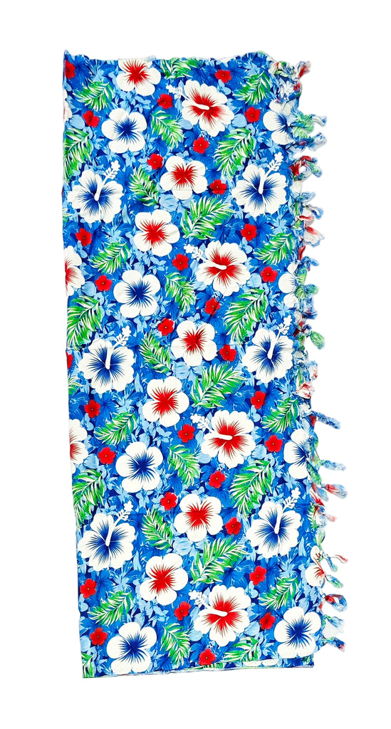 The Blue Hibiscus Sarong with Frills measures 2 Yards (1.8m x 1.1m), making it a perfect choice for beach or wrap-around wear. It is crafted from soft rayon material for a comfortable fit.
