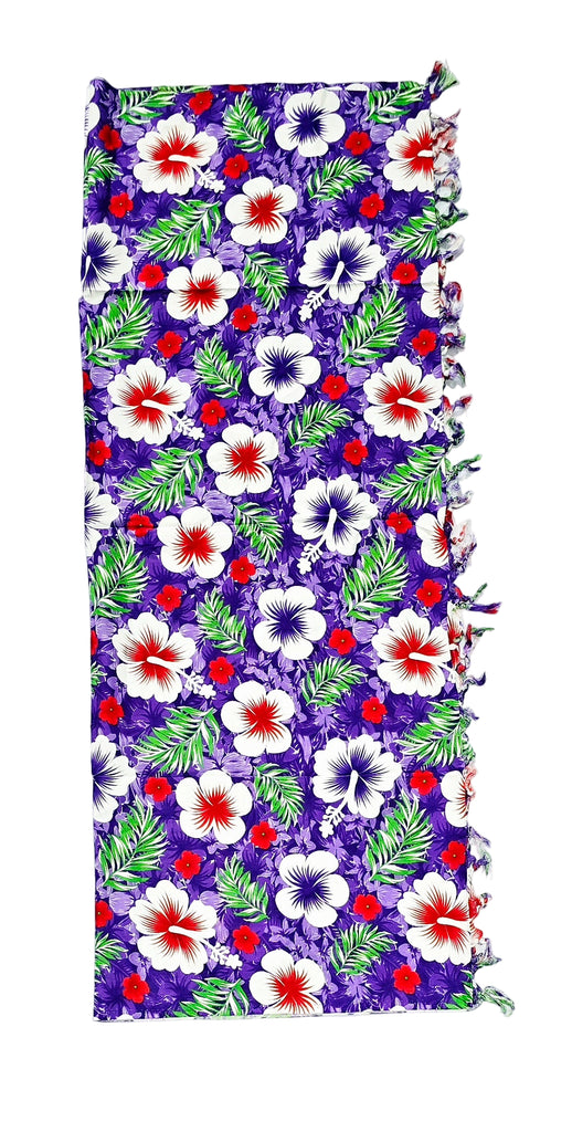 The Purple Hibiscus Sarong with Frills measures 2 Yards (1.8m x 1.1m), making it a perfect choice for beach or wrap-around wear. It is crafted from soft rayon material for a comfortable fit.